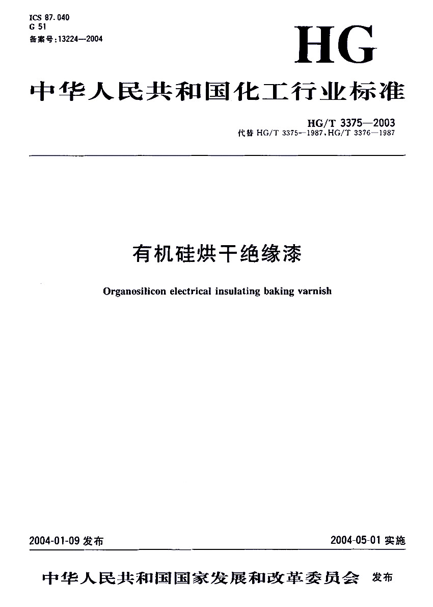 HG/T 3375-2003有機硅烘干絕緣漆標準 ICS87.040 G51 備案號:13224-2004 HG 中華人民共和國化工行業標準 HG/T 3375-2003代替 HG/T 3375-1987,HG/T 3376-1987 有機硅烘干絕緣漆Organosilicon electrical insulating baking varnish 2004-01-09發布,2004-