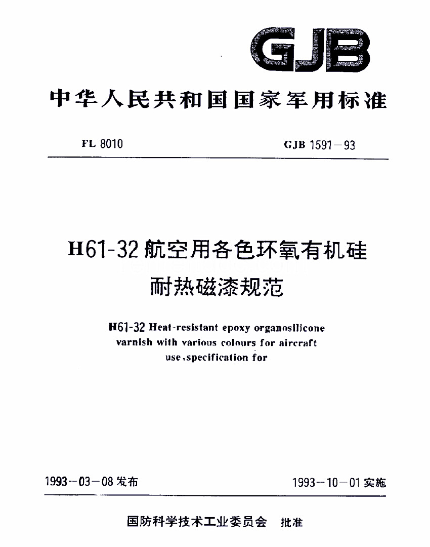 H61-83航空用各色環氧有機硅耐熱底漆規范標準GJB 1592-93 GJB 中華人民共和國國家軍用標準 FL8010 GJB 1592-93 H61-83航空用各色環氧有機硅耐熱底漆規范 H61-83 Heat-resistant epoxy organosilicnne primer with coating with various colours for aircraft use,sp